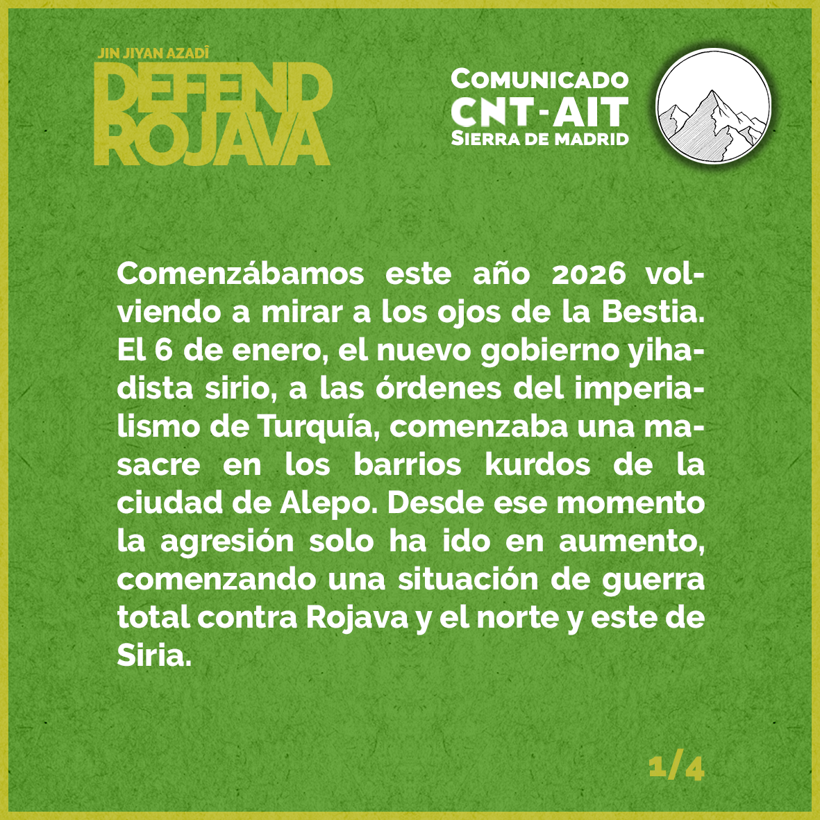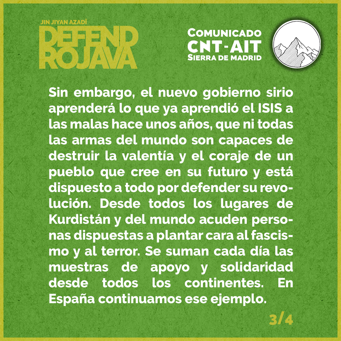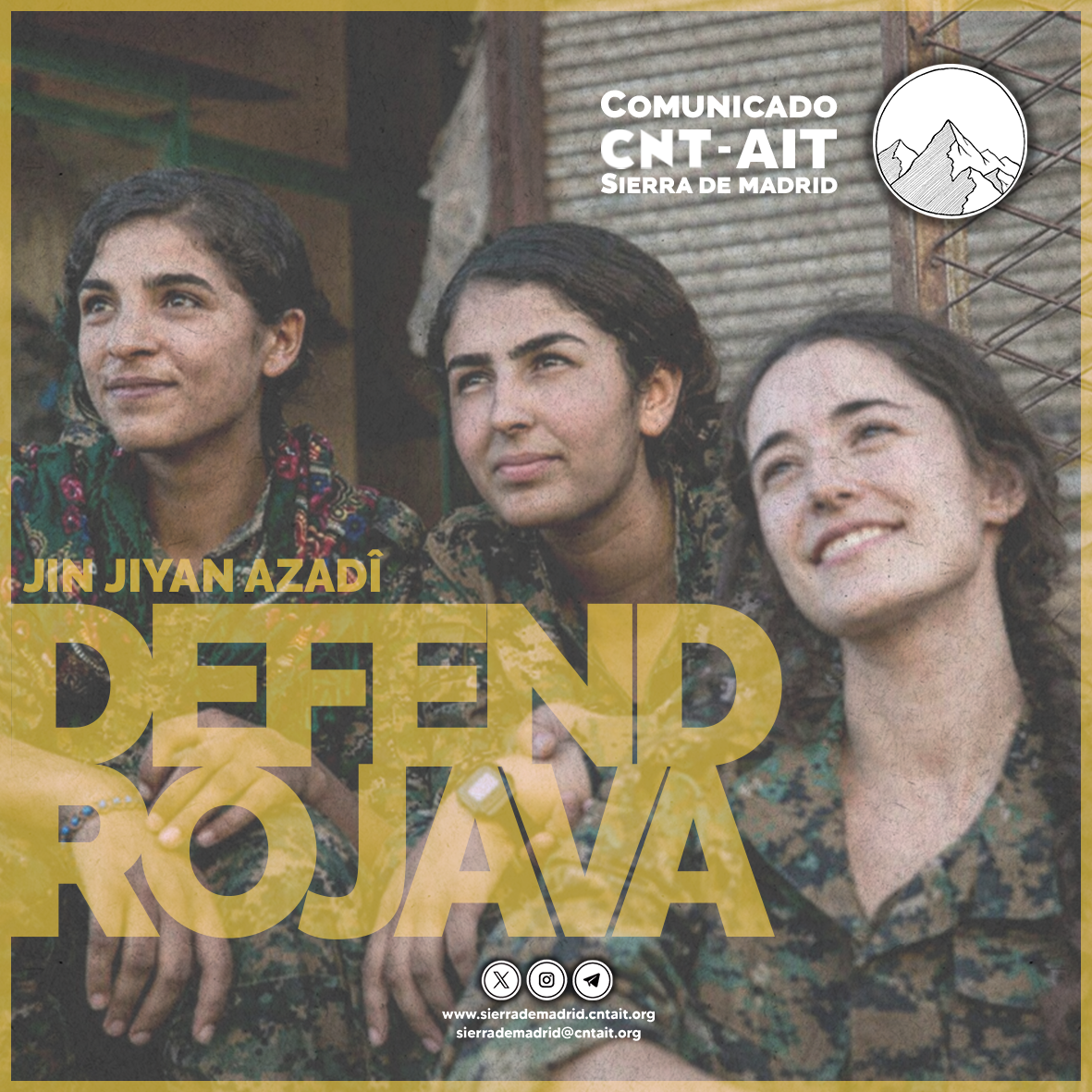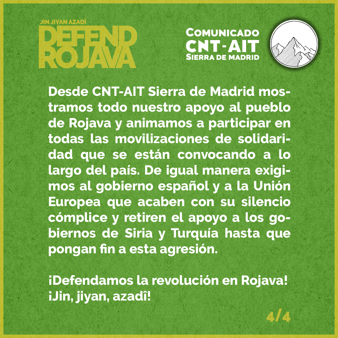 Desde CNT-AIT Sierra de Madrid mostramos todo nuestro apoyo al pueblo de Rojava y animamos a participar en todas las movilizaciones de solidaridad que se están convocando a lo largo del país. De igual manera exigimos al gobierno español y a la Unión Europea que acaben con su silencio cómplice y retiren el apoyo a los gobiernos de Siria y Turquía hasta que pongan fin a esta agresión.