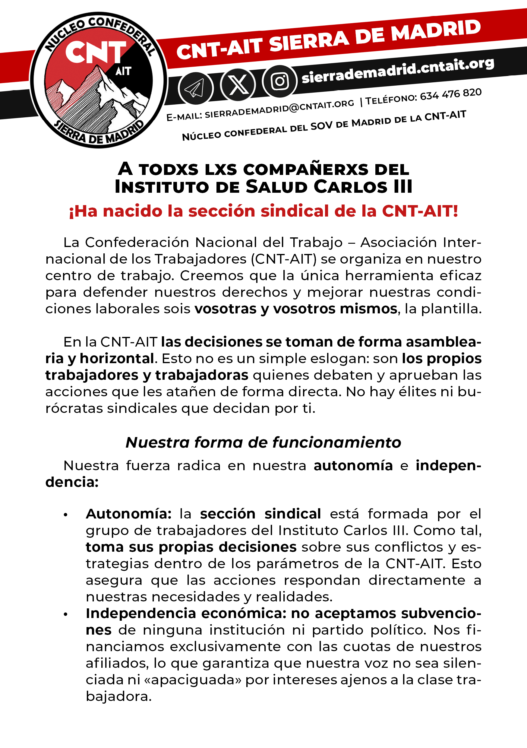 • Autonomía: la sección sindical está formada por el grupo de trabajadores del Instituto Carlos III. Como tal, toma sus propias decisiones sobre sus conflictos y estrategias dentro de los parámetros de la CNT-AIT. Esto asegura que las acciones respondan directamente a nuestras necesidades y realidades.
